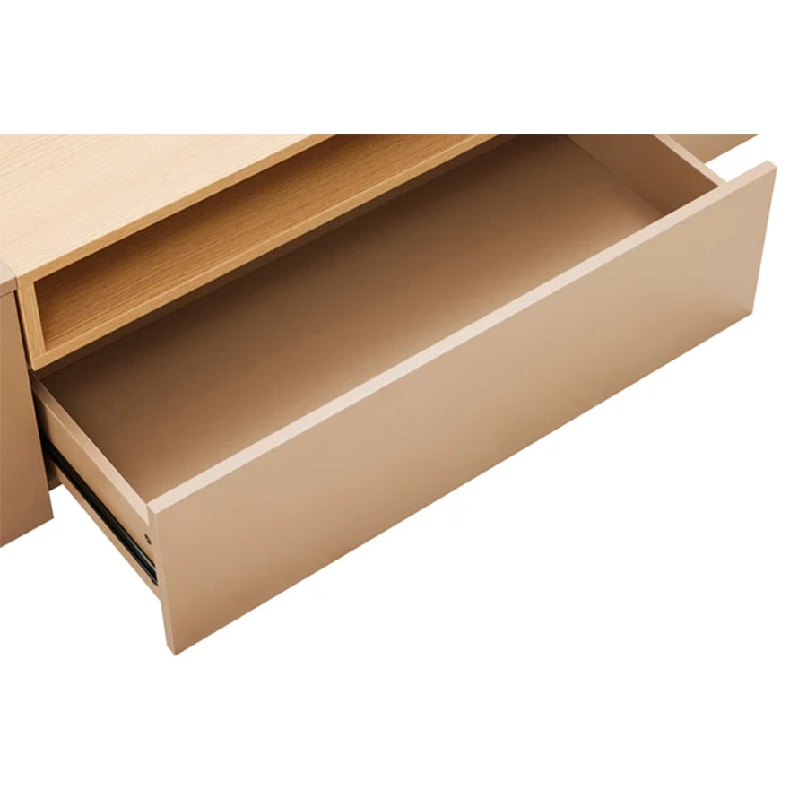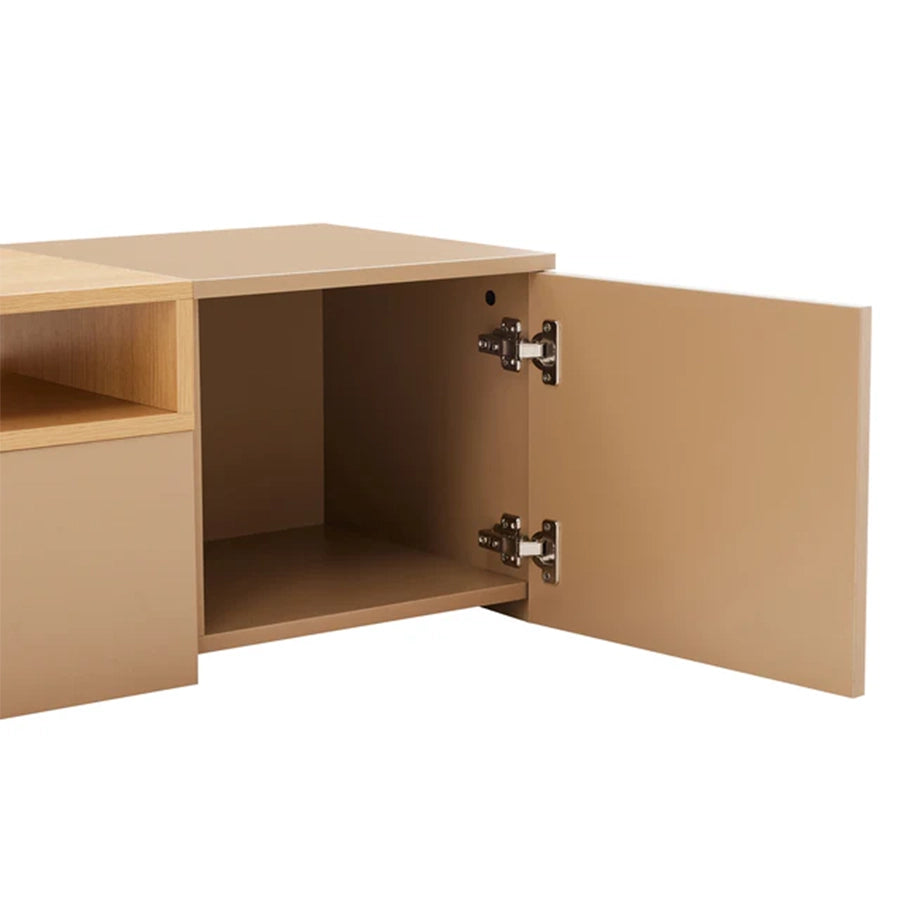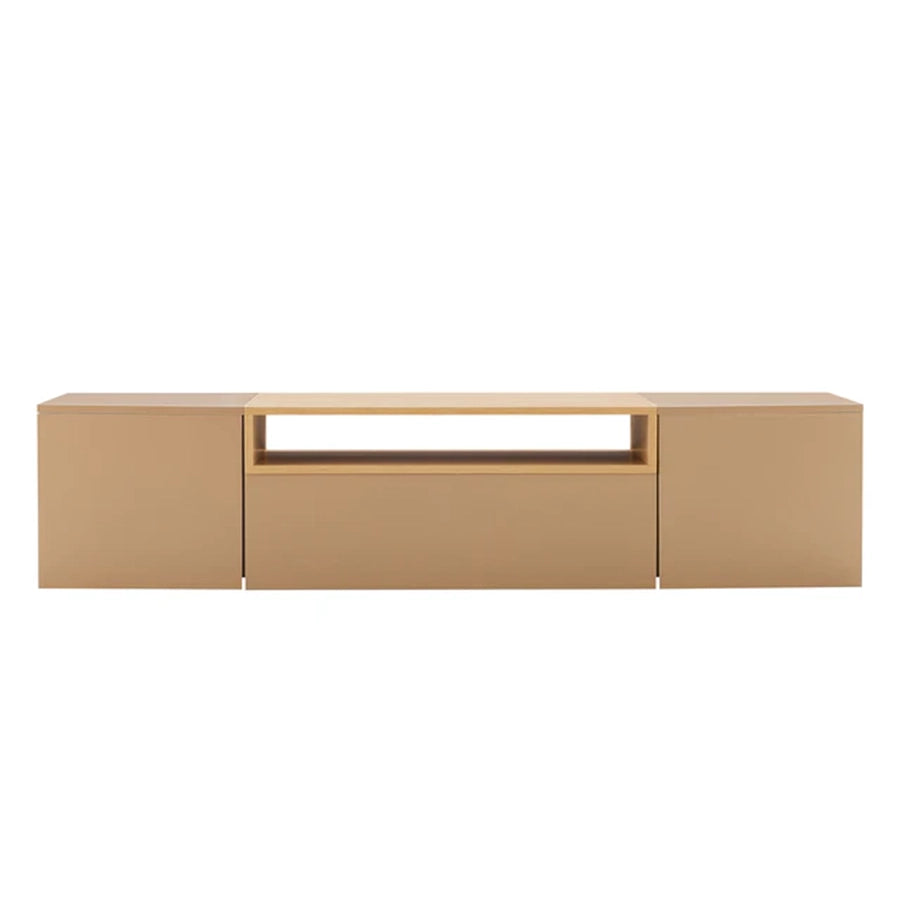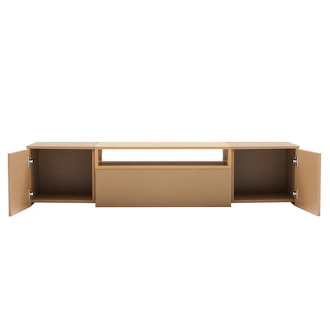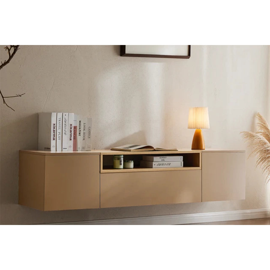 Comoda TV Loft maro suspendată este ideală într-un living modern și aerisit: culoarea deschisă și designul minimalist pun în valoare ecranul televizorului fără a încărca vizual pereții. Combin-o cu mobilier în tonuri neutre sau accente naturale pentru a crea impresia de spațiu extins și pentru a menține o atmosferă relaxată în zona de zi.