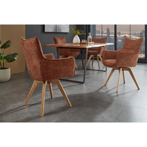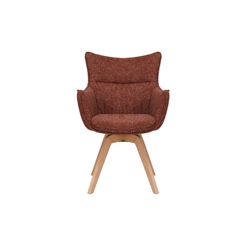 Un scaun conceput pentru confortul cotidian — modelul Vogue în ton maro-rust cu tapiţerie din poliester şi bază rotativă oferă libertatea de mişcare în jurul mesei şi o prezenţă discretă într-un dining modern. Forma simplă şi funcţia de rotaţie îl fac util atât pentru utilizarea de zi cu zi, cât şi pentru momentele când primesc musafiri.