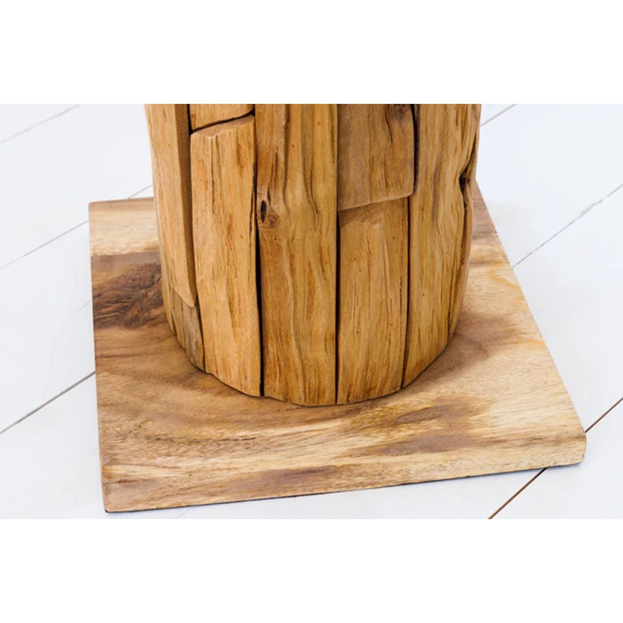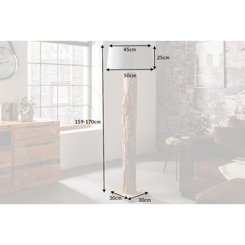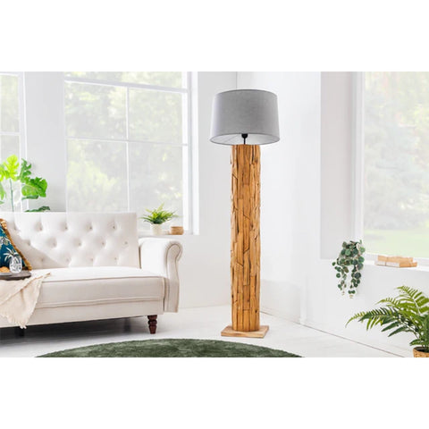 Lampadarul Roots II se potrivește foarte bine într-un living cu accente naturale: lângă un fotoliu cu tapițerie neutra, pe un covor din fibre naturale sau lângă o plantă verde. Lemnul tec adaugă textură și căldură, iar lumina caldă accentuează spațiul fără să îl domine.