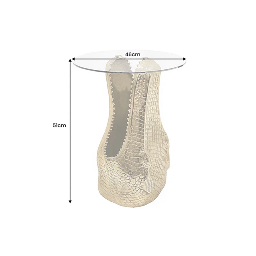 Masă de cafea Crocodile este o masa de cafea rotundă cu structură metalică cu finisaj auriu (gold) și blat din sticlă, proiectată pentru livinguri moderne și zone de relaxare. Designul inspirat din textura pielii de crocodil adaugă o notă sculpturală și profundă, transformând masa într-o piesă centrală vizuală fără a încărca spațiul.