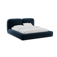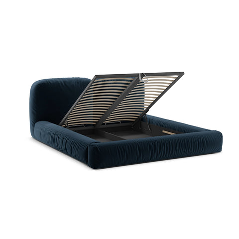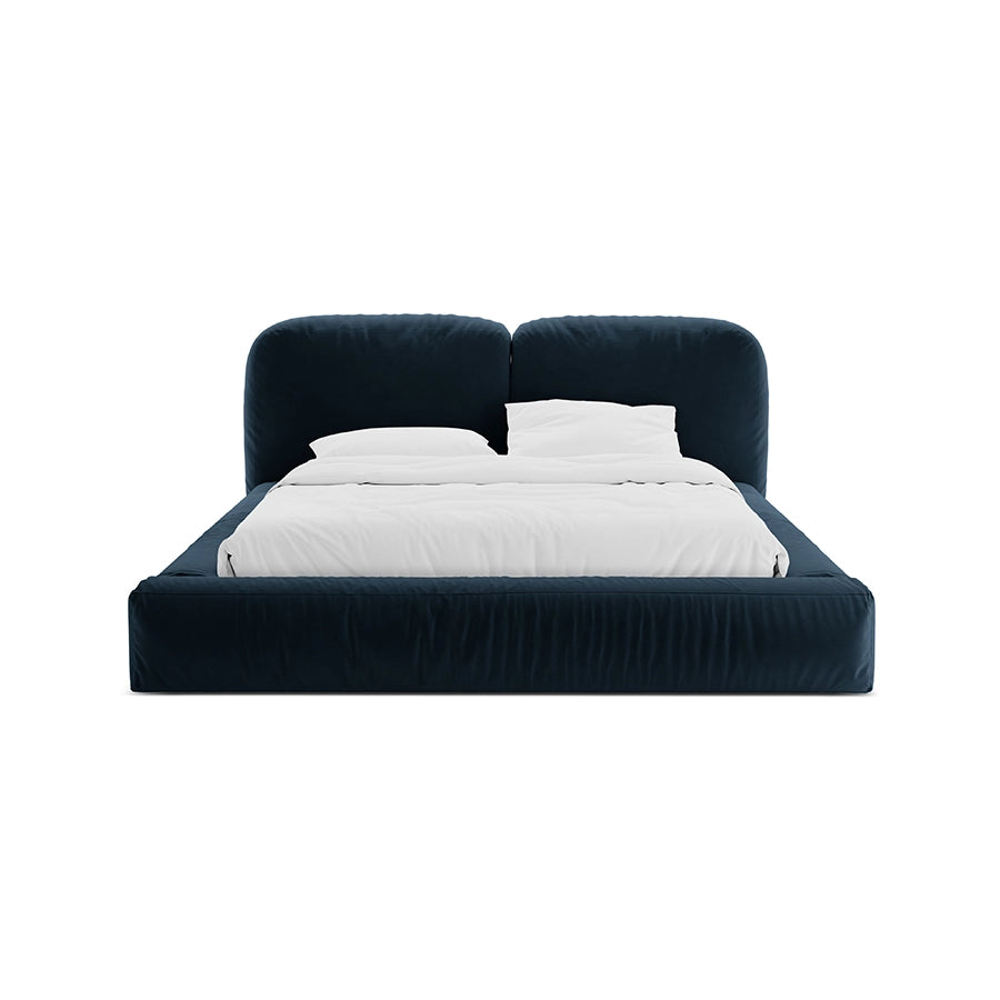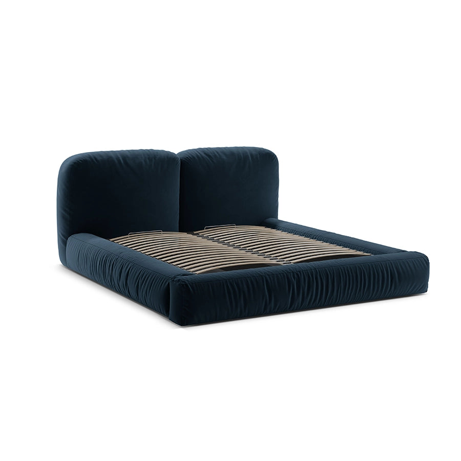 Acest pat devine elementul care structurează camera, fără să o domine, oferind un fundal neutru ce se potrivește cu palete cromatice diverse, textile fine și detalii minimaliste. Albastrul catifelat al tapițeriei este expresia unui confort modern, prietenos și totodată sofisticat.
