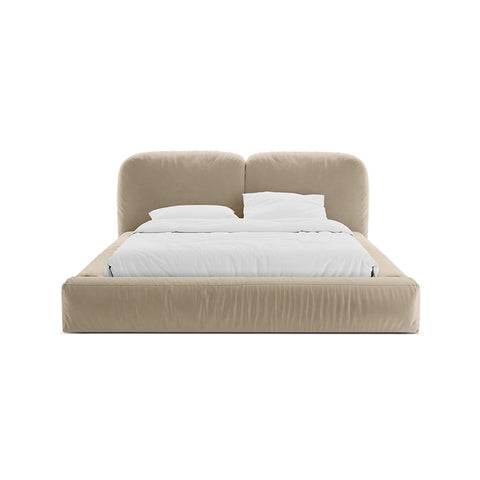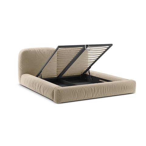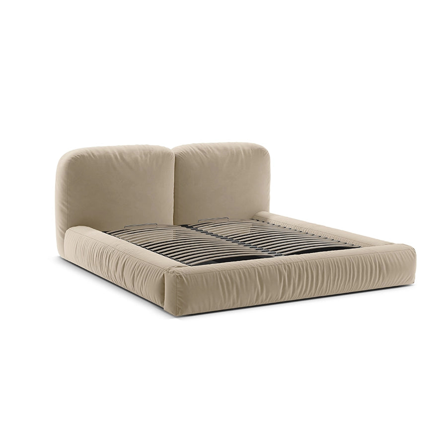 Acest pat devine elementul care structurează camera, fără să o domine, oferind un fundal neutru ce se potrivește cu palete cromatice diverse, textile fine și detalii minimaliste. Bejul catifelat al tapițeriei este expresia unui confort modern, prietenos și totodată sofisticat.