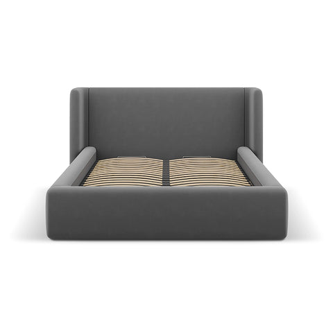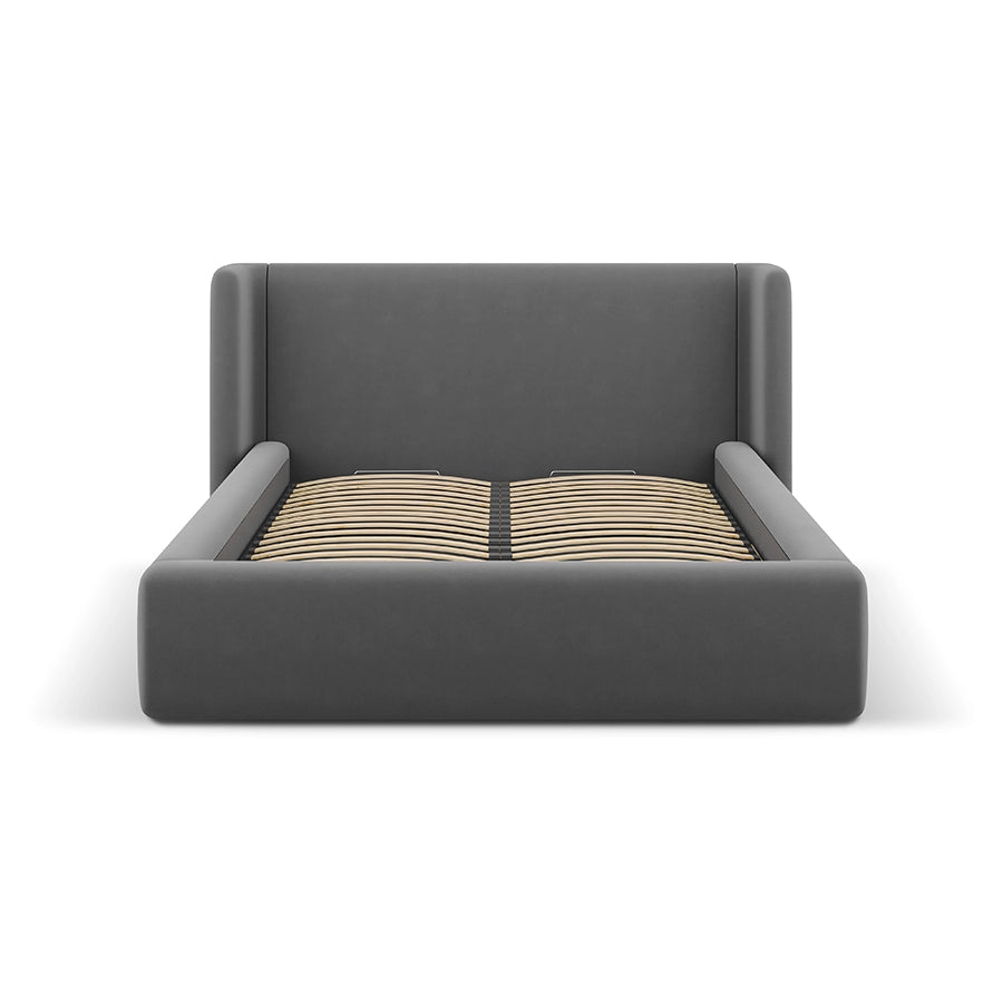 - Materiale: Tapițerie din catifea, spumă poliuretanică (densitate 25 kg/m³), cadru metalic cu lamele din placaj și lemn