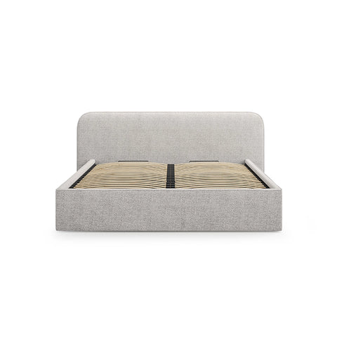 — Materiale: material bouclé, spumă poliuretanică (densitate 25 kg/m³), cadru metalic cu lamele din placaj și lemn