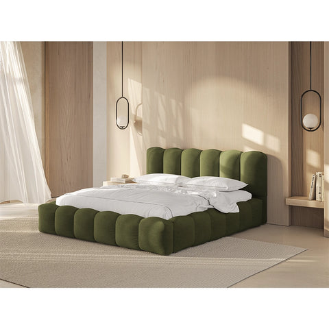 Fiecare seară devine un moment de eleganță și relaxare odată ce te așezi pe patul Lupine. Tapitat într-un bouclé verde, cu textură moale la atingere, acest pat îți oferă confort și prezență vizuală. Cadrul din lemn de pin și MDF îi conferă stabilitate, iar spuma poliuretanică de densitate 25 kg/m³ garantează o susținere plăcută – tot ce ai nevoie să te odihnești profund după o zi plină.