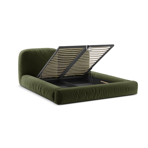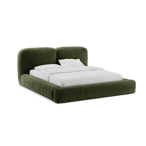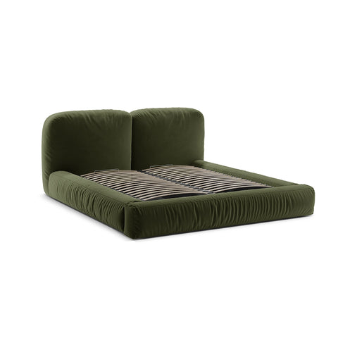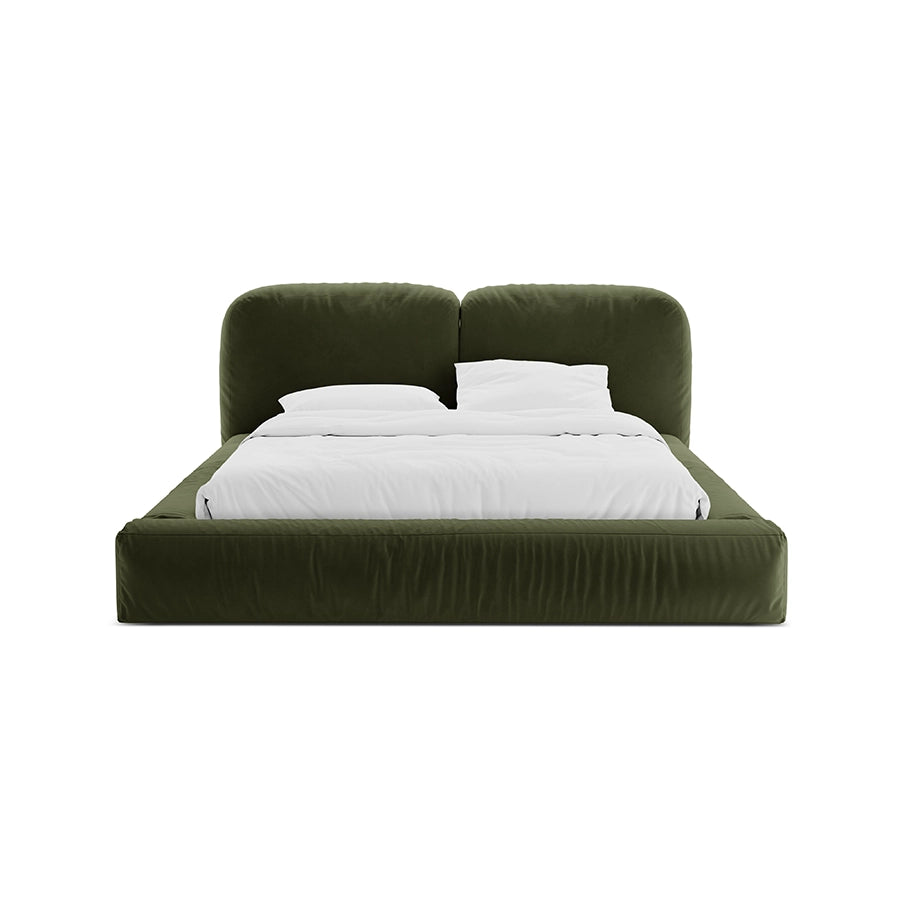 Acest pat devine elementul care structurează camera, fără să o domine, oferind un fundal neutru ce se potrivește cu palete cromatice diverse, textile fine și detalii minimaliste. Verdele catifelat al tapițeriei este expresia unui confort modern, prietenos și totodată sofisticat.