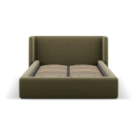 - Materiale: Tapițerie din catifea, spumă poliuretanică (densitate 25 kg/m³), cadru metalic cu lamele din placaj și lemn