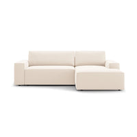 Canapeaua extensibilă cu colț bej deschis din catifea Jodie Right îmbină designul modern cu funcționalitatea, oferind un spațiu de relaxare versatil. Tapițeria din textil Megan de culoare bej deschis conferă un aspect elegant și ușor de integrat în diverse tipuri de decor.