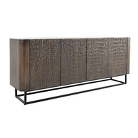Comoda Croco în nuanță caldă de maro oferă un design unic prin textura tridimensională sculptată manual în lemn de mango. Susținută de o bază metalică neagră, solidă și discretă, croiala sculpturală conferă eleganță organică și profunzime vizuală, perfectă pentru livinguri, holuri sau zone de dining cu stil.