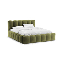 Fiecare seară devine un moment de eleganță și relaxare odată ce te așezi pe patul Lupine. Tapitat într-un bouclé verde, cu textură moale la atingere, acest pat îți oferă confort și prezență vizuală. Cadrul din lemn de pin și MDF îi conferă stabilitate, iar spuma poliuretanică de densitate 25 kg/m³ garantează o susținere plăcută – tot ce ai nevoie să te odihnești profund după o zi plină.