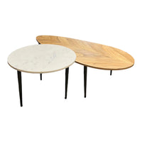 Două măsuțe care pot fi atât funcționale, cât și sculpturale — Setul Adlon îmbină lemnul natural de salcâm cu blaturi elegante din marmură și cadre metalice negre, într-un design curat și contemporan. Fie le folosești împreună pentru un efect de simetrie, fie separat pentru flexibilitate, ele aduc căldură, rafinament și armonie în sufrageria ta.