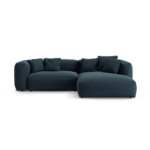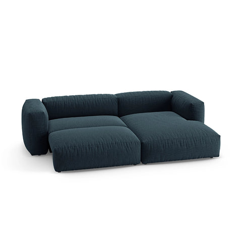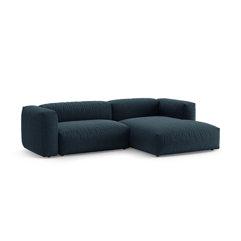 Se integrează natural într-un living luminos sau într-o cameră deschisă, unde forma configurată de colț creează un punct focal clar. Nuanța albastră echilibrează materiale naturale precum lemnul și textilele neutre, iar extensia oferă flexibilitate suplimentară pentru utilizare ocazională. Completează zona socială cu o măsuță joasă și iluminat cald pentru a construi o compoziție coerentă și plăcută în fiecare zi.