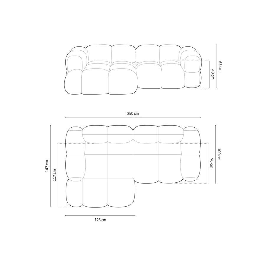 — Adâncime șezut: 70 cm (spătar) / 117 cm (secțiune colț)
