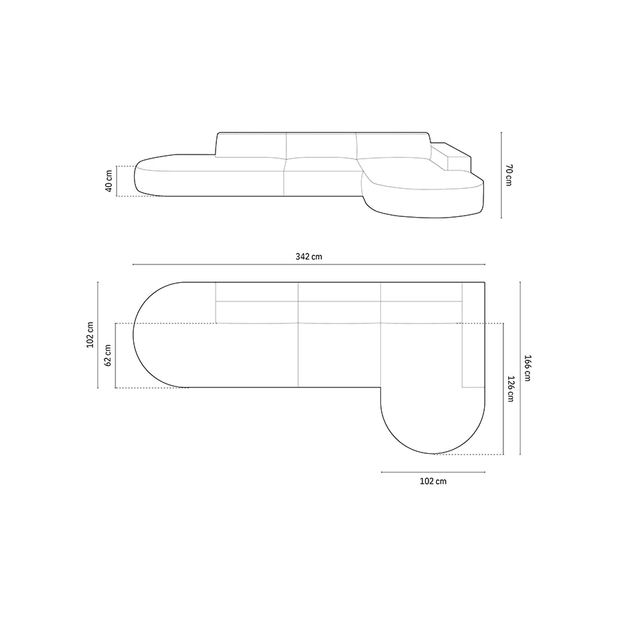 — Dimensiuni: Lungime 342 cm, Lăţime 166 / 120 cm, Înălţime 70 cm, Înălţime şezut 40 cm, Adâncime şezut 62 cm