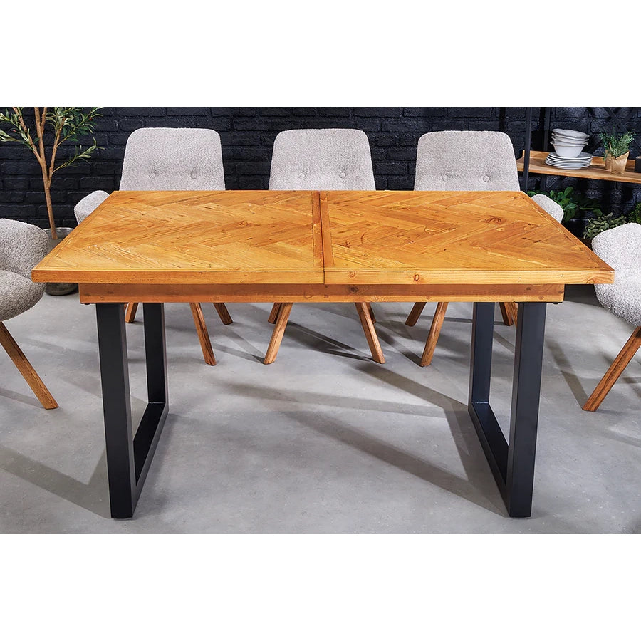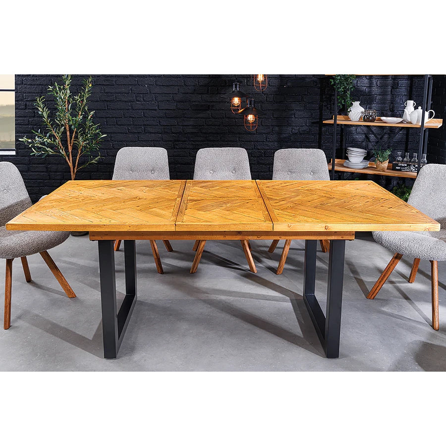 Masa Mosaik maro, cu blat extensibil de la 120 cm la 160 cm, transformă fiecare masă într-o ocazie — fie o cină în doi, fie o adunare cu prieteni. Nuanța caldă și naturală a lemnului de pin reciclat aduce un aer primitor și familiar, în timp ce mecanismul de extensie îți oferă flexibilitatea de care ai nevoie în funcţie de moment. Cu picioare solide și o prezență discretă, dar distinctă, Mosaik devine inima diningului tău: un loc unde mâncarea, discuțiile și clipurile importante se întrepătrund într-o atmosferă intimă și relaxată.