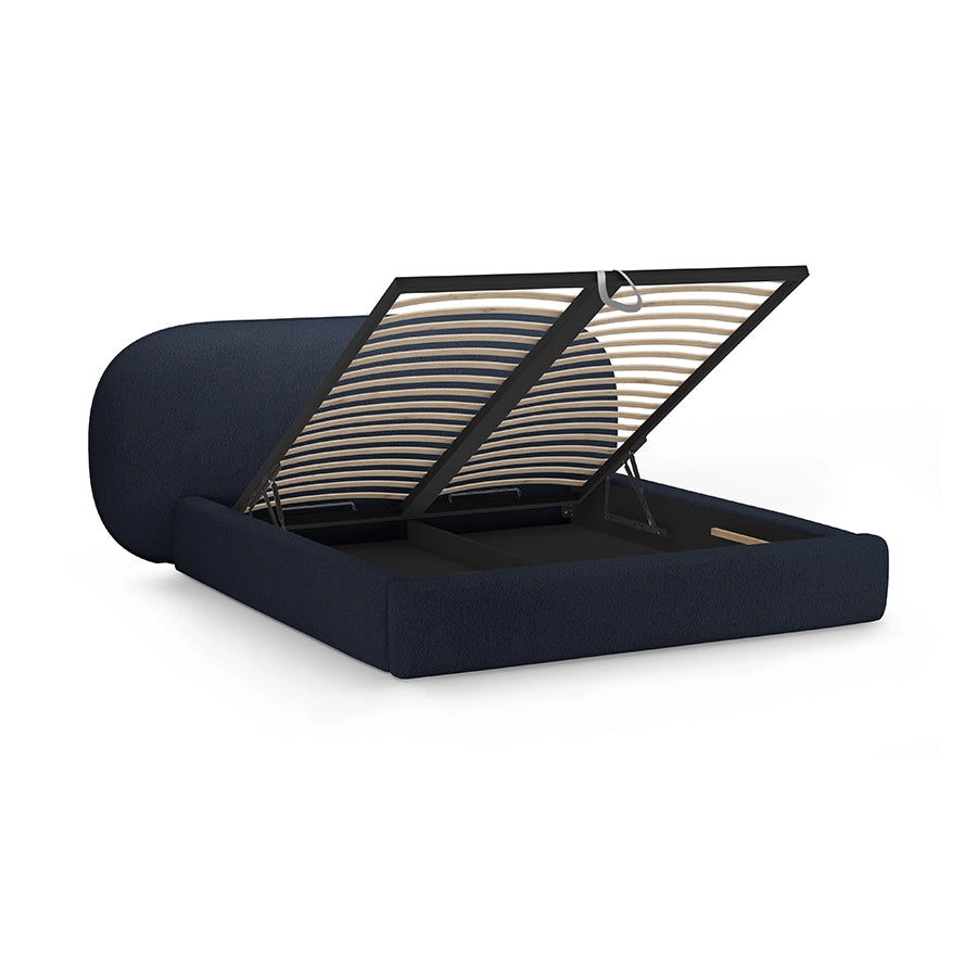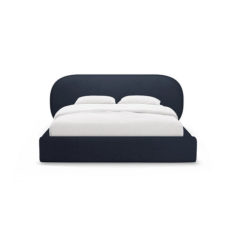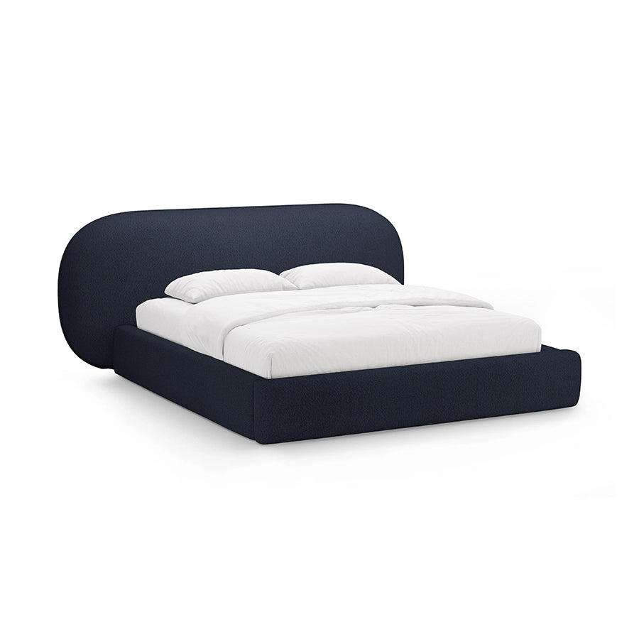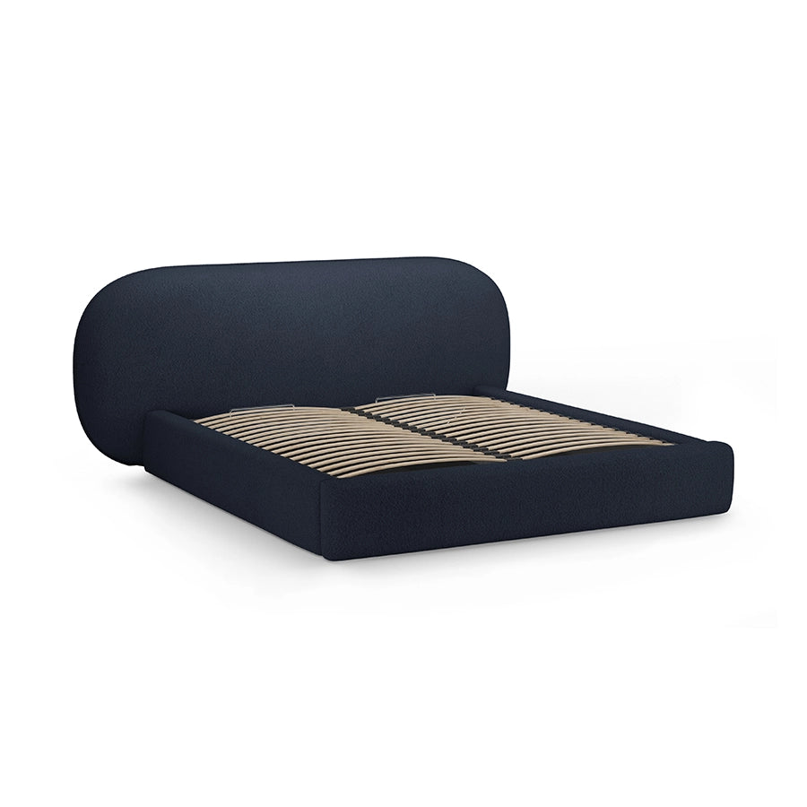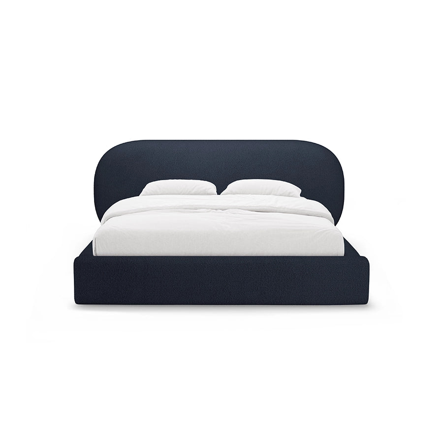 Patul Ovalo, tapițat în material bouclé albastru, este gândit pentru dormitoare în care confortul vizual și cel fizic sunt la fel de importante. Forma sa amplă, cu tăblie generoasă și linii rotunjite, creează un sentiment de siguranță și relaxare încă de la prima vedere. Textura bouclé adaugă profunzime și o senzație plăcută la atingere, făcând patul să pară primitor, fără a încărca spațiul.