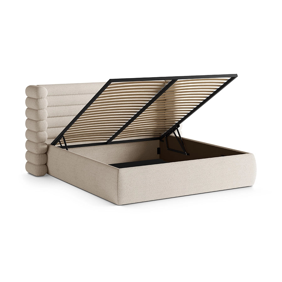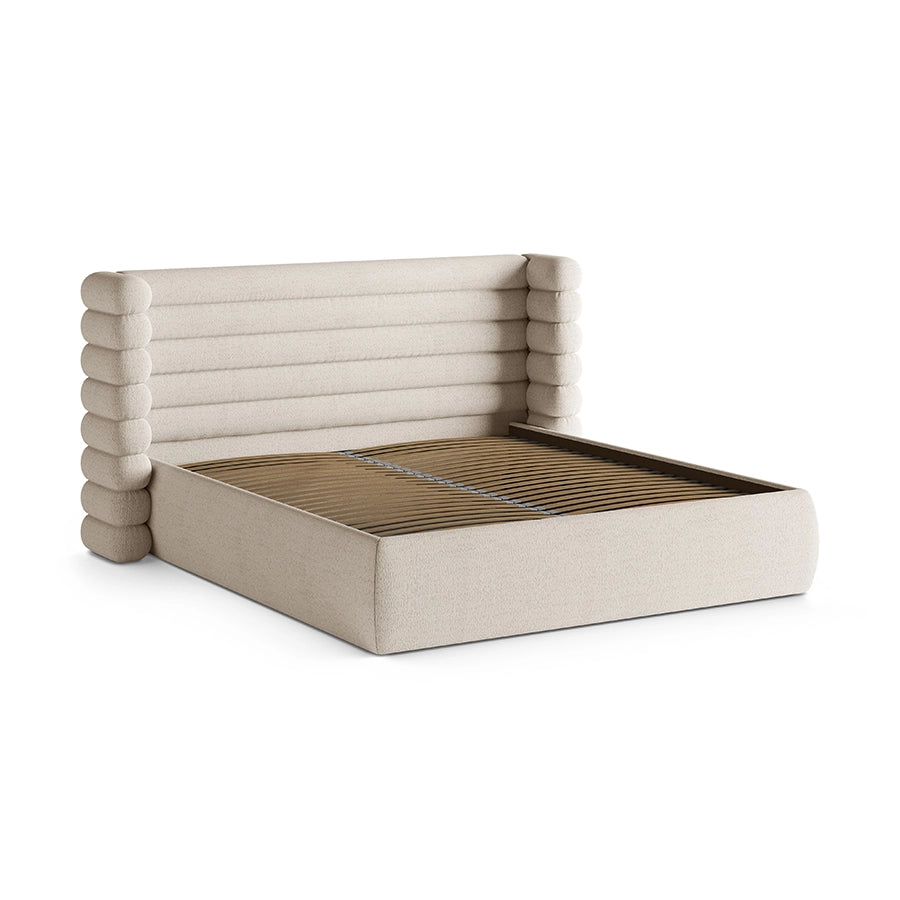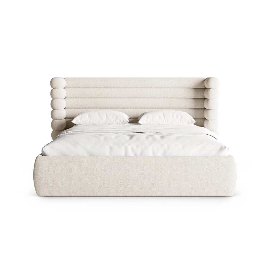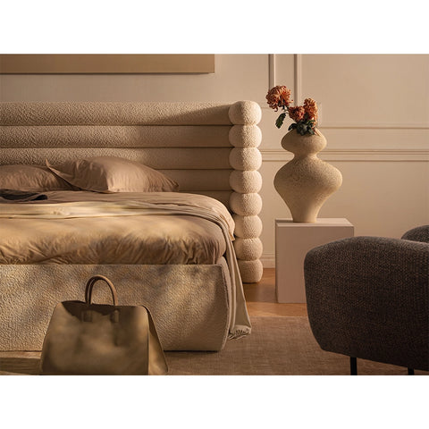 Mount este un pat care redefinește ideea de confort prin formă și textură. Tapițeria din material buclat bej deschis aduce o senzație tactilă caldă, aproape protectoare, iar volumul său generos creează un punct de stabilitate în dormitor. Este o piesă care nu cere atenție prin detalii stridente, ci prin felul în care ocupă spațiul: calm, sigur, bine așezat.