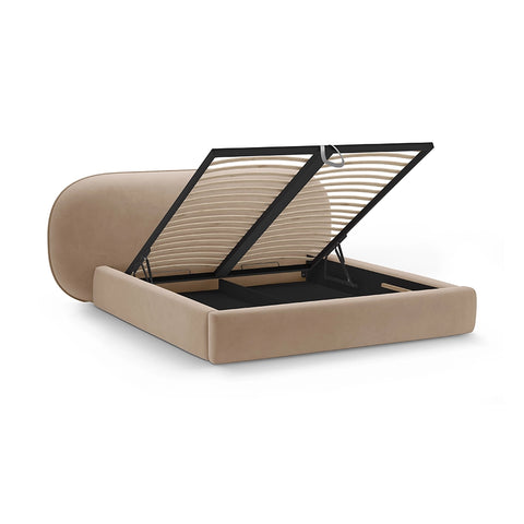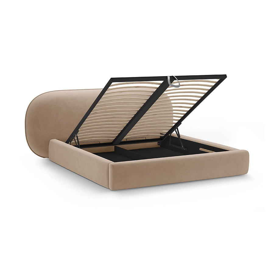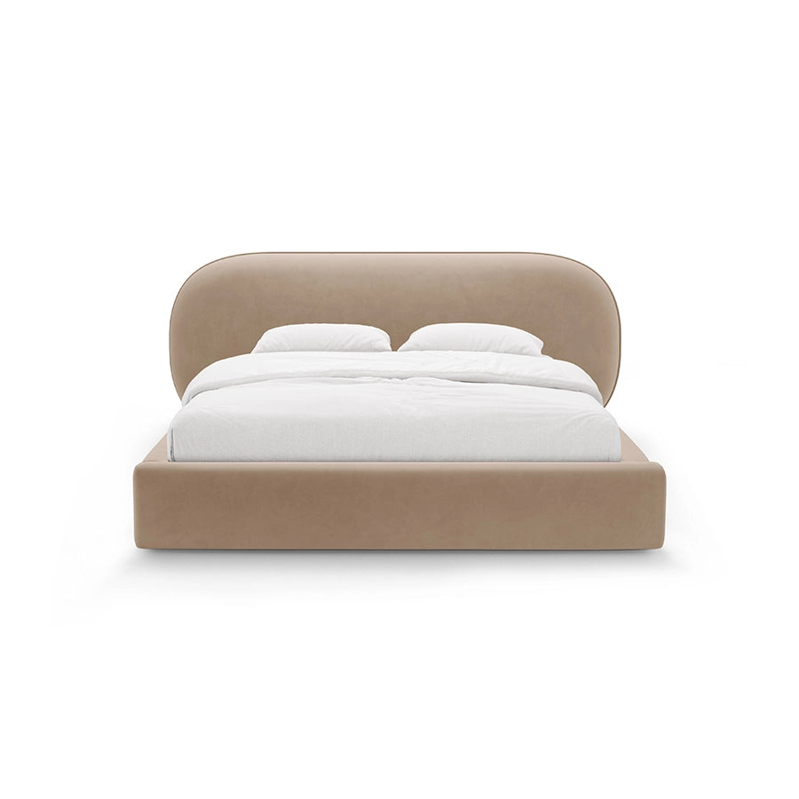 Patul Ovalo din catifea bej inchis se integrează excelent într-un dormitor cu paletă cromatică neutră, unde nuanțele calde și naturale predomină. Finisajul bej creează o bază armonioasă pentru textile în tonuri similare sau contraste delicate, fără a încărca vizual spațiul. Poate fi completat cu noptiere din lemn natural, corpuri de iluminat simple și covoare texturate pentru un ambient liniștit și elegant.
