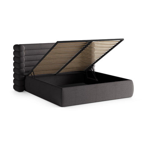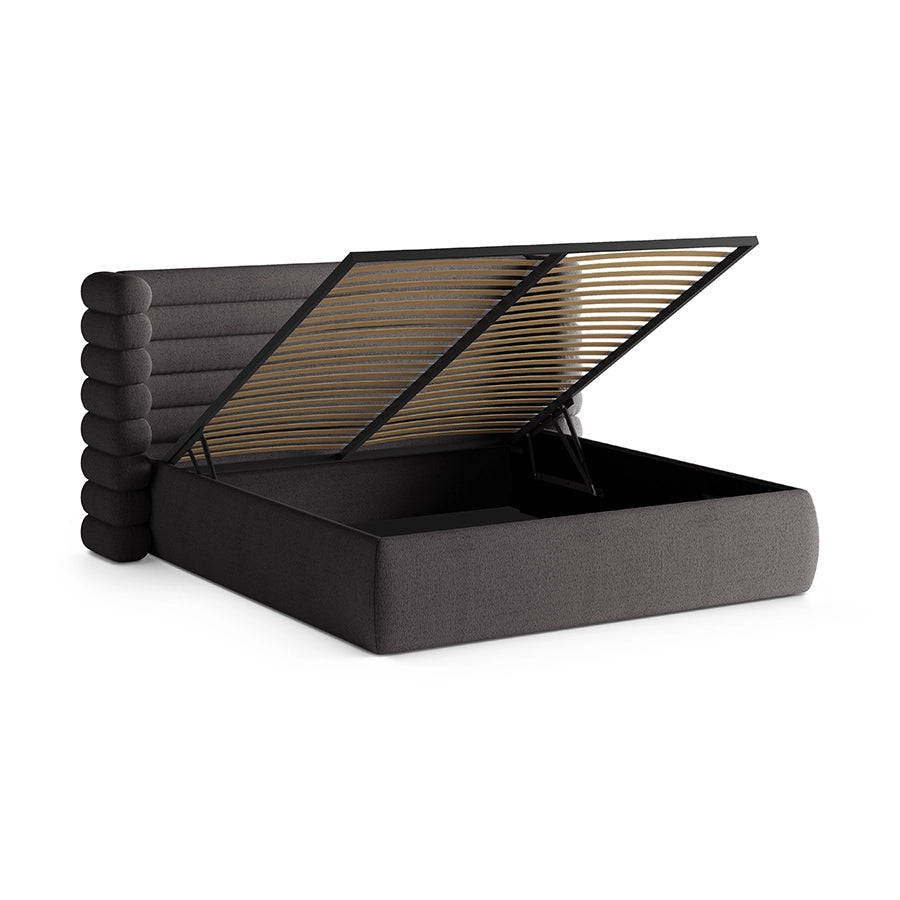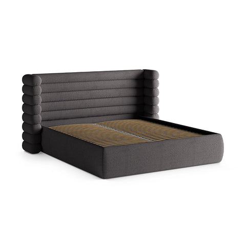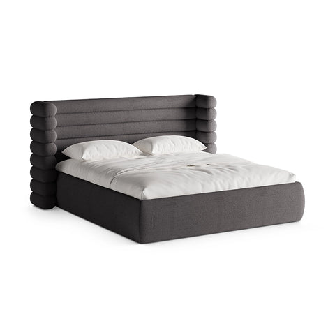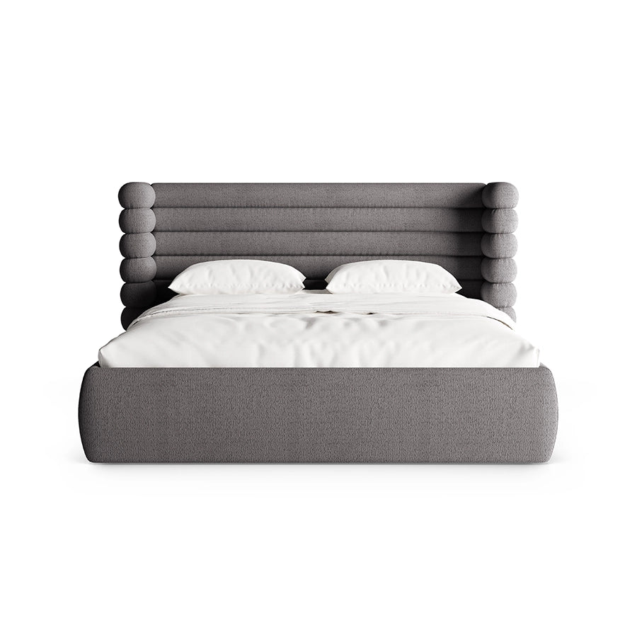Mount este un pat care redefinește ideea de confort prin formă și textură. Tapițeria din material buclat gri grafit aduce o senzație tactilă caldă, aproape protectoare, iar volumul său generos creează un punct de stabilitate în dormitor. Este o piesă care nu cere atenție prin detalii stridente, ci prin felul în care ocupă spațiul: calm, sigur, bine așezat.