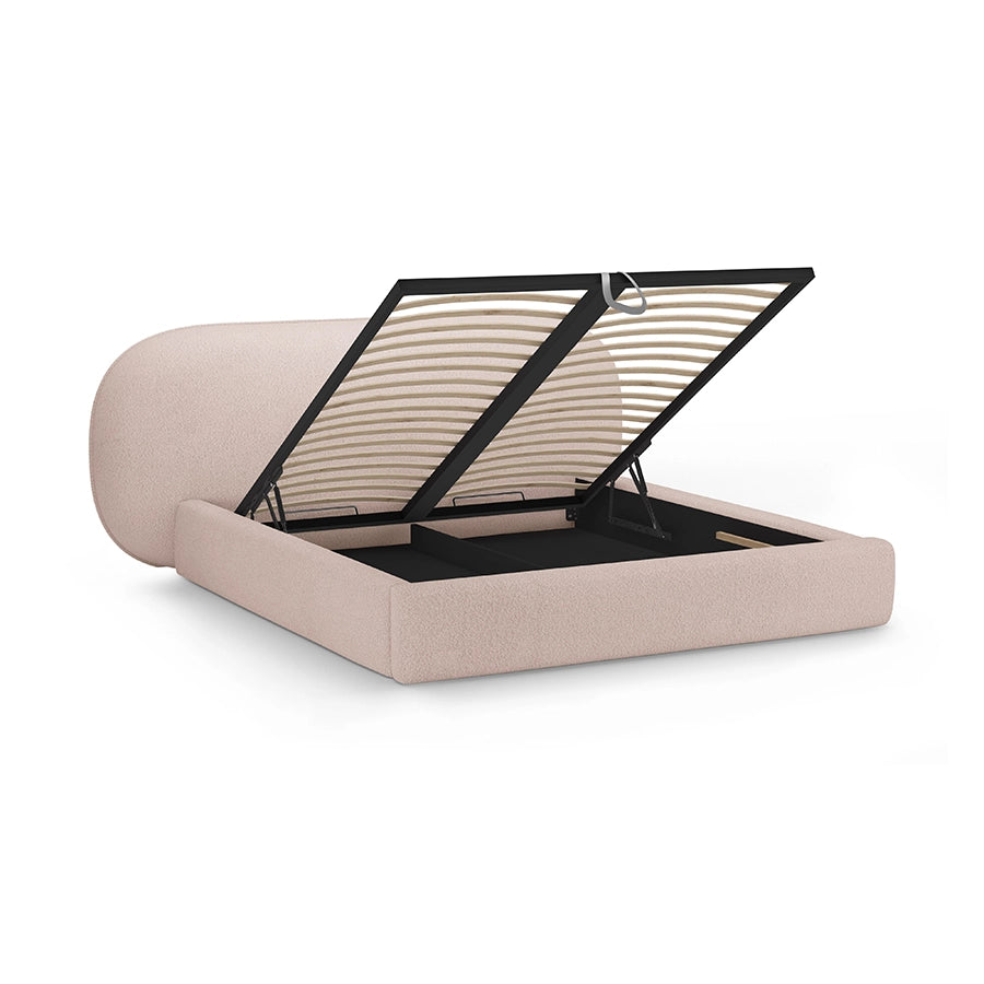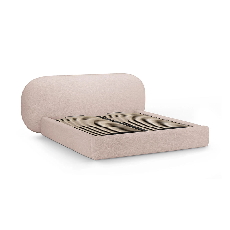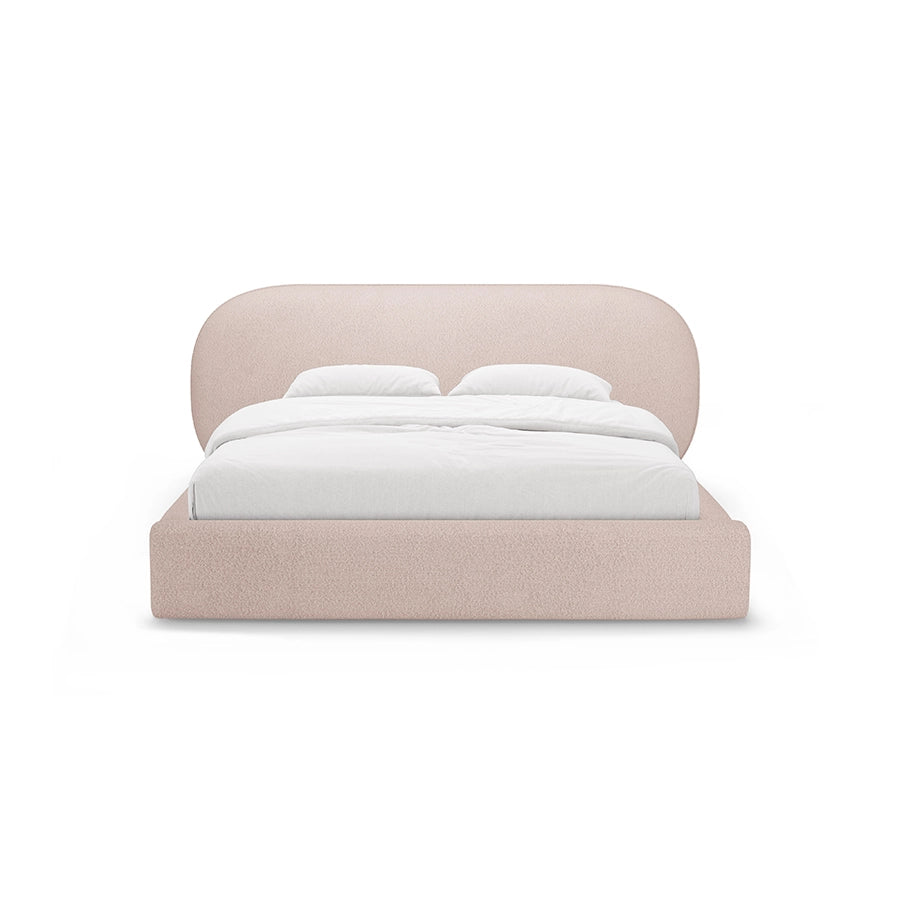 Patul Ovalo, tapițat în material bouclé roz, este gândit pentru dormitoare în care confortul vizual și cel fizic sunt la fel de importante. Forma sa amplă, cu tăblie generoasă și linii rotunjite, creează un sentiment de siguranță și relaxare încă de la prima vedere. Textura bouclé adaugă profunzime și o senzație plăcută la atingere, făcând patul să pară primitor, fără a încărca spațiul.