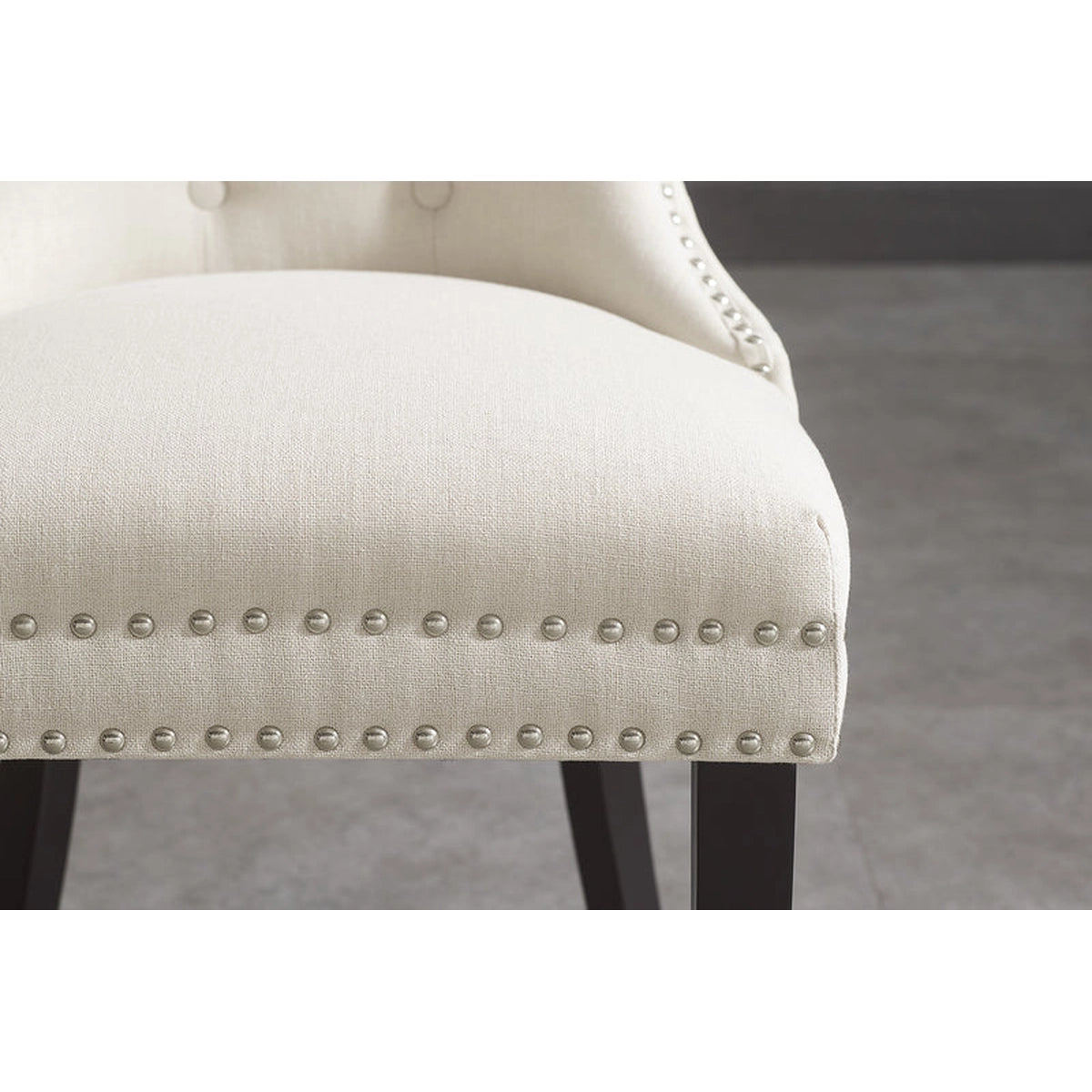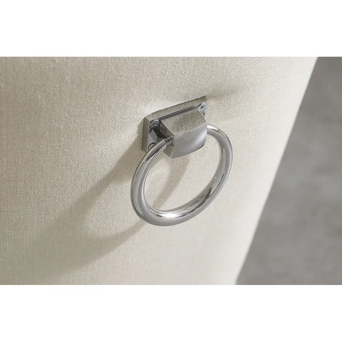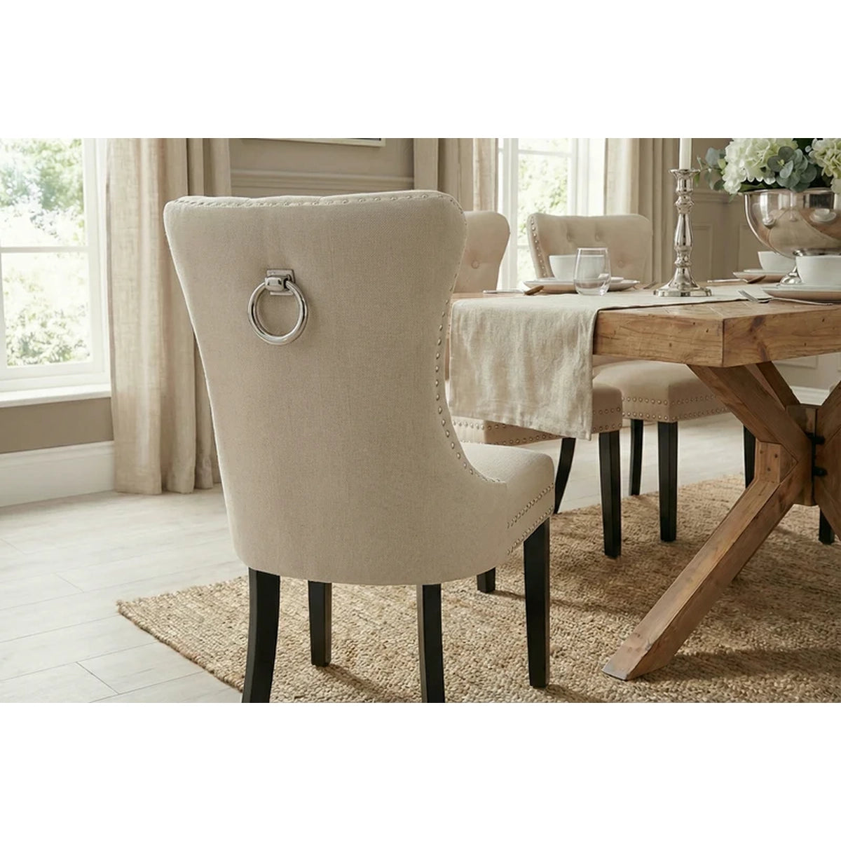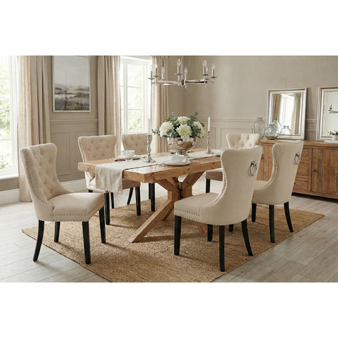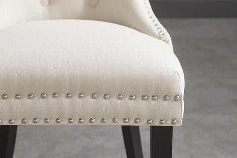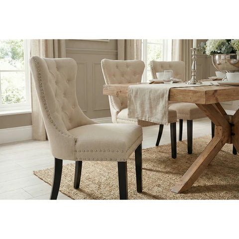 Forma clasică, cu influențe baroque și detalii inspirate din stilul Chesterfield, creează o prezență elegantă, dar caldă. Tapițeria din in bej este luminoasă și ușor de integrat, iar textura adaugă un plus de naturalețe. Mânerul metalic de pe spătar nu este doar un detaliu vizual — este și practic, mai ales când muți scaunul frecvent.