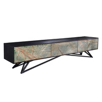 Această comodă redefinește zona media: fronturile cu furnir ce imită structura naturală a pietrei se contopesc cu lemnul de salcâm lacuit și cadrul metalic negru pentru o estetică dramatică şi sofisticată. Finisajele multicolore adaugă caracter vizual, transformând piesa într-un element de artă funcțional în livingul tău.